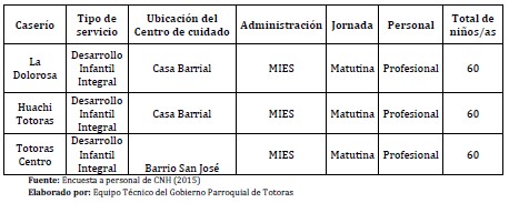 Se trata de una modalidad de intervención directa del MIES y brinda sus servicios a la población los tres caseríos de Totoras. Por parte del Gobierno Parroquial existe la coordinación logística a fin de facilitar la localización de los centros de atención infantil. Son tres profesionales quienes asisten como Promotoras para visitar a los niños y niñas de entre 0 y 36 meses de edad.